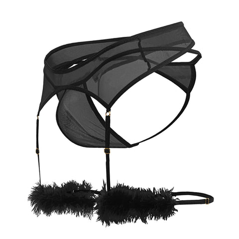 This provocative men’s garter thong by CandyMan blends sheer fabric with playful and sensual details. The see-through mesh waistband and pouch offer minimal coverage for a daring, seductive look, while the attached garter straps extend down the thighs, creating a bold fetish-inspired design. The faux fur accents on the thigh straps add a playful touch, contrasting with the sleek fabric and enhancing the overall sensual appeal. Perfect for those who enjoy adventurous, eye-catching lingerie with a daring edge.