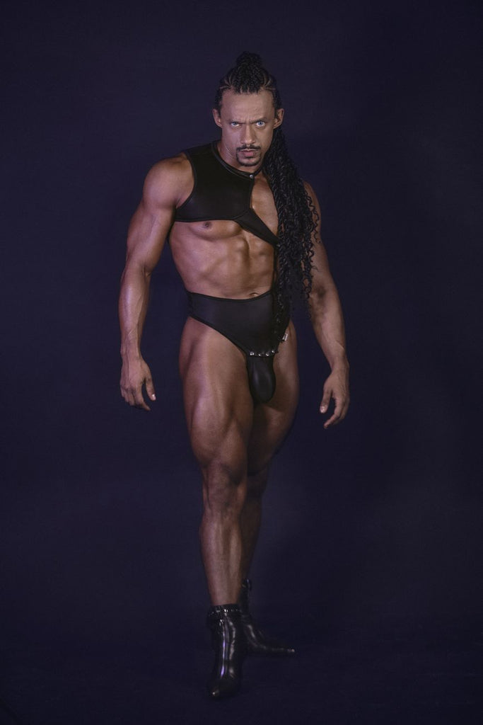 This striking men’s bodysuit by CandyMan features an asymmetric design that combines bold style with a modern, edgy look. The one-shoulder cut and snap-button closures create a unique silhouette, while the high-cut waist and thong back enhance the body’s contours. Made from sleek, stretchy fabric, this bodysuit offers a comfortable, form-fitting experience while standing out with its daring and provocative design. Ideal for men looking to make a bold fashion statement.