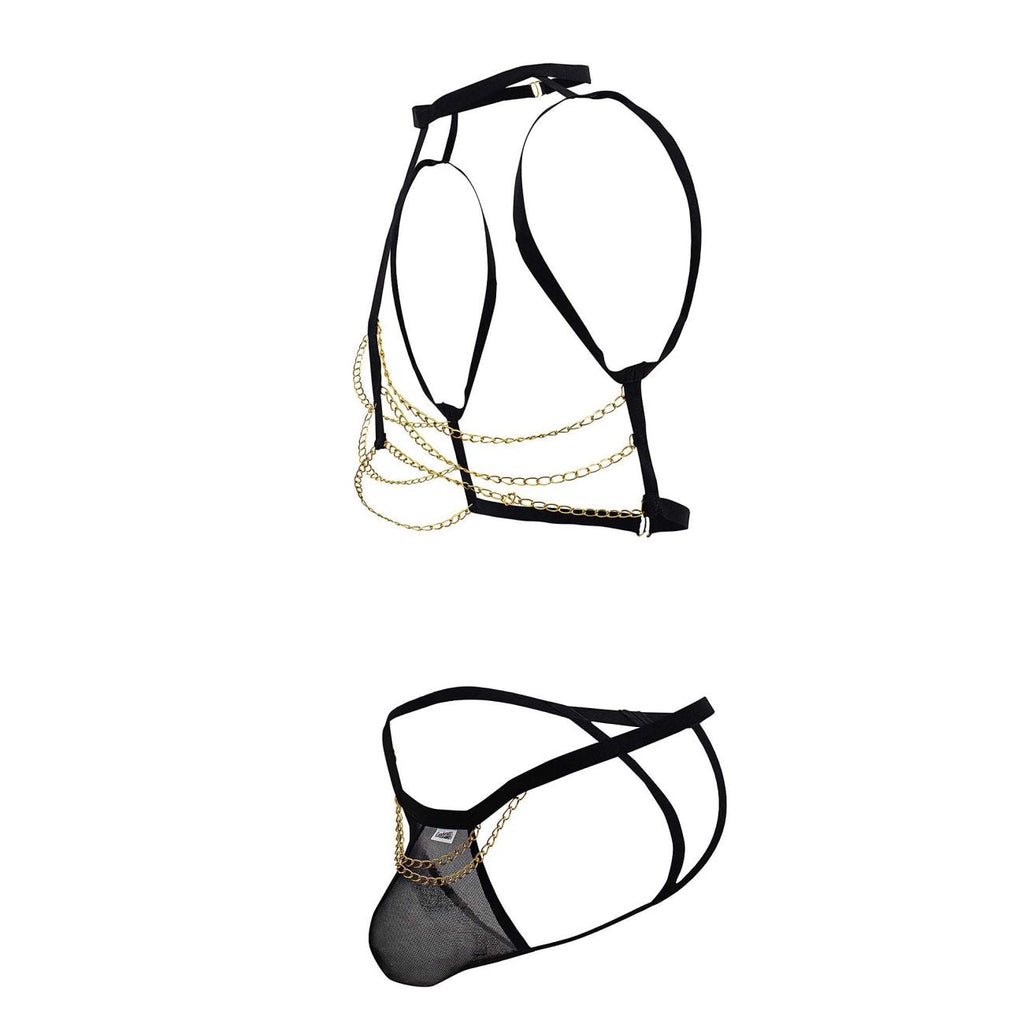 Turn up the heat with this bold and seductive chain harness set! Designed for those who love to make a statement, this daring ensemble features a sleek black thong with gold chain accents and a matching harness that demands attention. Whether you're looking to spice things up or simply feel unstoppable, this set is all about confidence, allure, and pure power.