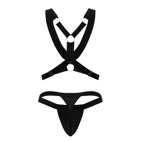 Unleash your inner rebel! This harness thong set is the ultimate combination of dominance and seduction. Featuring adjustable elastic straps with bold metal ring accents, this design sculpts your body, highlighting every contour with an irresistible edge. The wet-look thong offers a sleek, skin-tight fit, while the matching arm sleeve adds a touch of intrigue. Perfect for making a statement in or out of the bedroom.