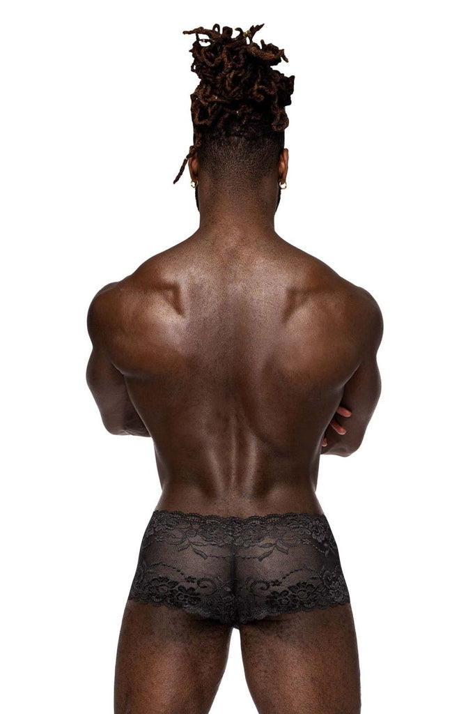 Mini short sheer pouch features a low cut scallop edged waist, high cut scalloped edged legs and a sheer mesh see thru pouch. Scallop edged floral stretch lace joins sheer stretch mesh and solid nylon stretch paneled inserts.