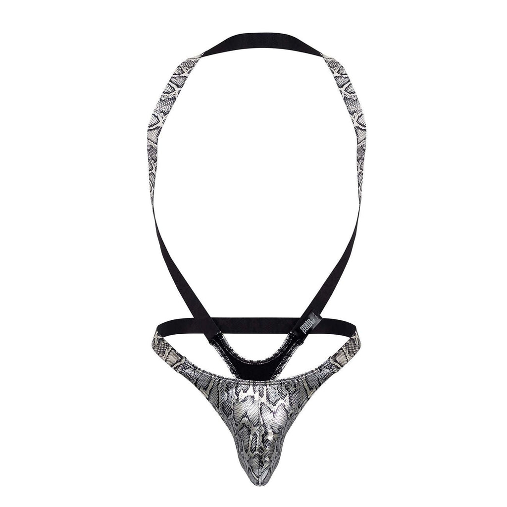 From the S'naked collection by Male Power, the Shoulder Sling Harness Thong features a behind the neck strap and sling, attached to a pouch thong. Poly Spandex metallic coated all way stretch printed fabric.