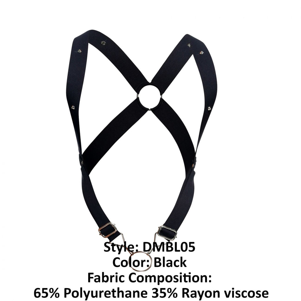 Wide straps on harness on an imitation leather fabric. Completely open back and front. Metallic accents. Metallic cock ring.