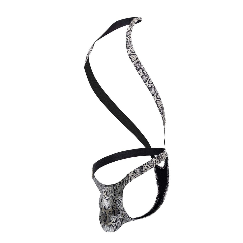 From the S'naked collection by Male Power, the Shoulder Sling Harness Thong features a behind the neck strap and sling, attached to a pouch thong. Poly Spandex metallic coated all way stretch printed fabric.