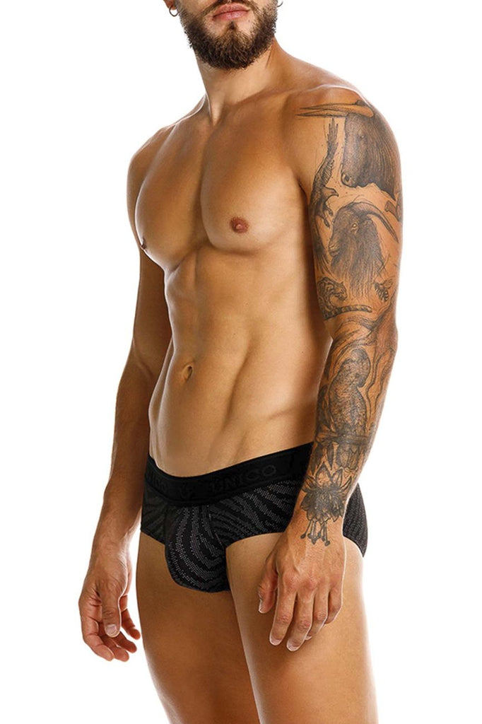 Command attention with these bold black printed briefs by UNICO, featuring a striking zigzag pattern and a sleek, matte-black branded waistband. The contoured front pouch offers enhanced support, while the low-rise cut ensures a modern, flattering silhouette. Made from soft, stretchy fabric, these briefs provide maximum comfort and a refined fit for any occasion.